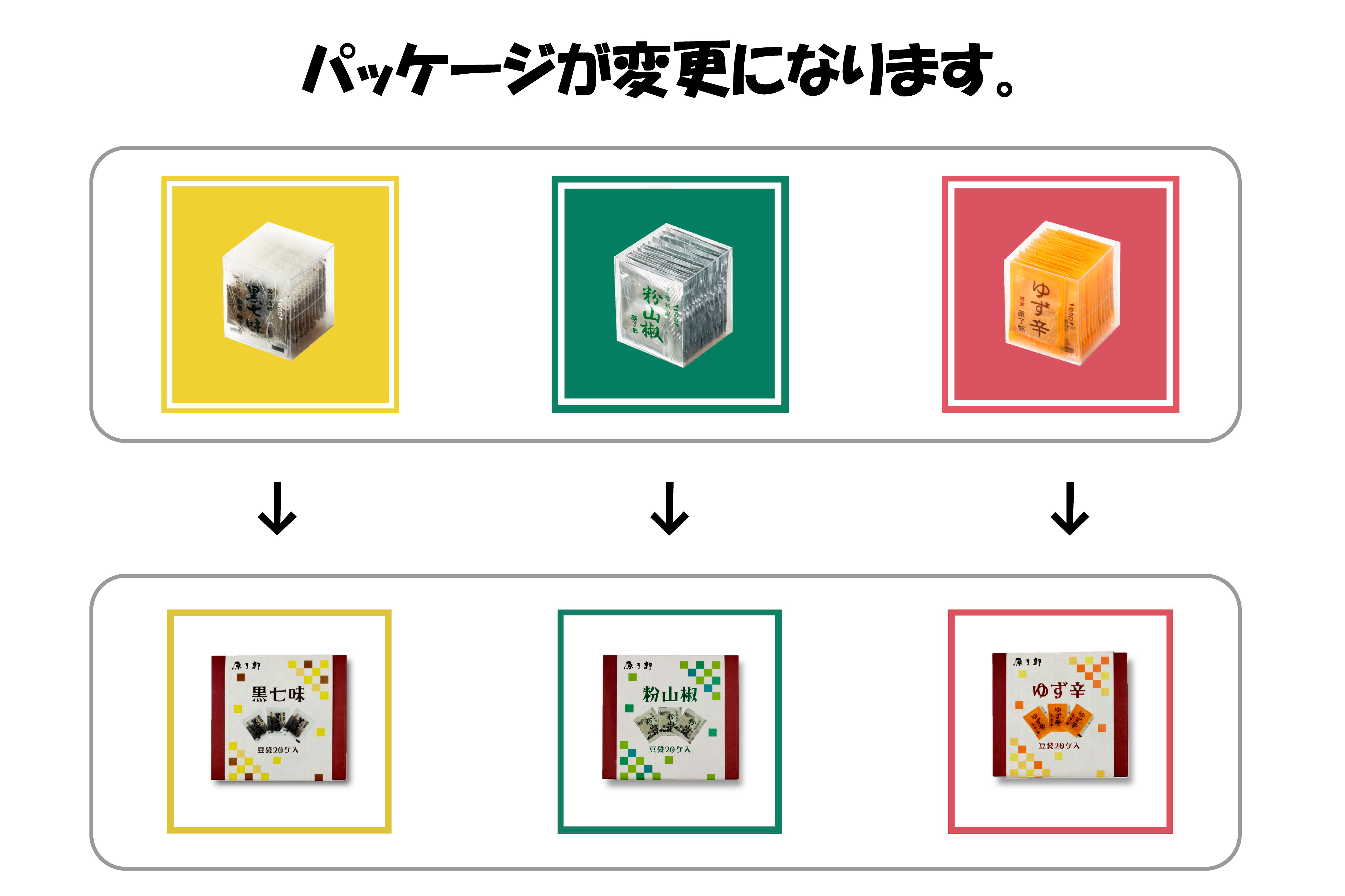 豆袋パッケージ変更のお知らせ いつもご利用いただきありがとうございます。 さてこのたび、2025年7月1日発送分より「黒七味 豆袋・粉山椒 豆袋・ゆず辛 豆袋」のパッケージを変更させていただきます。 今後も引き続きご愛顧を賜りますようお願い申し上げます。