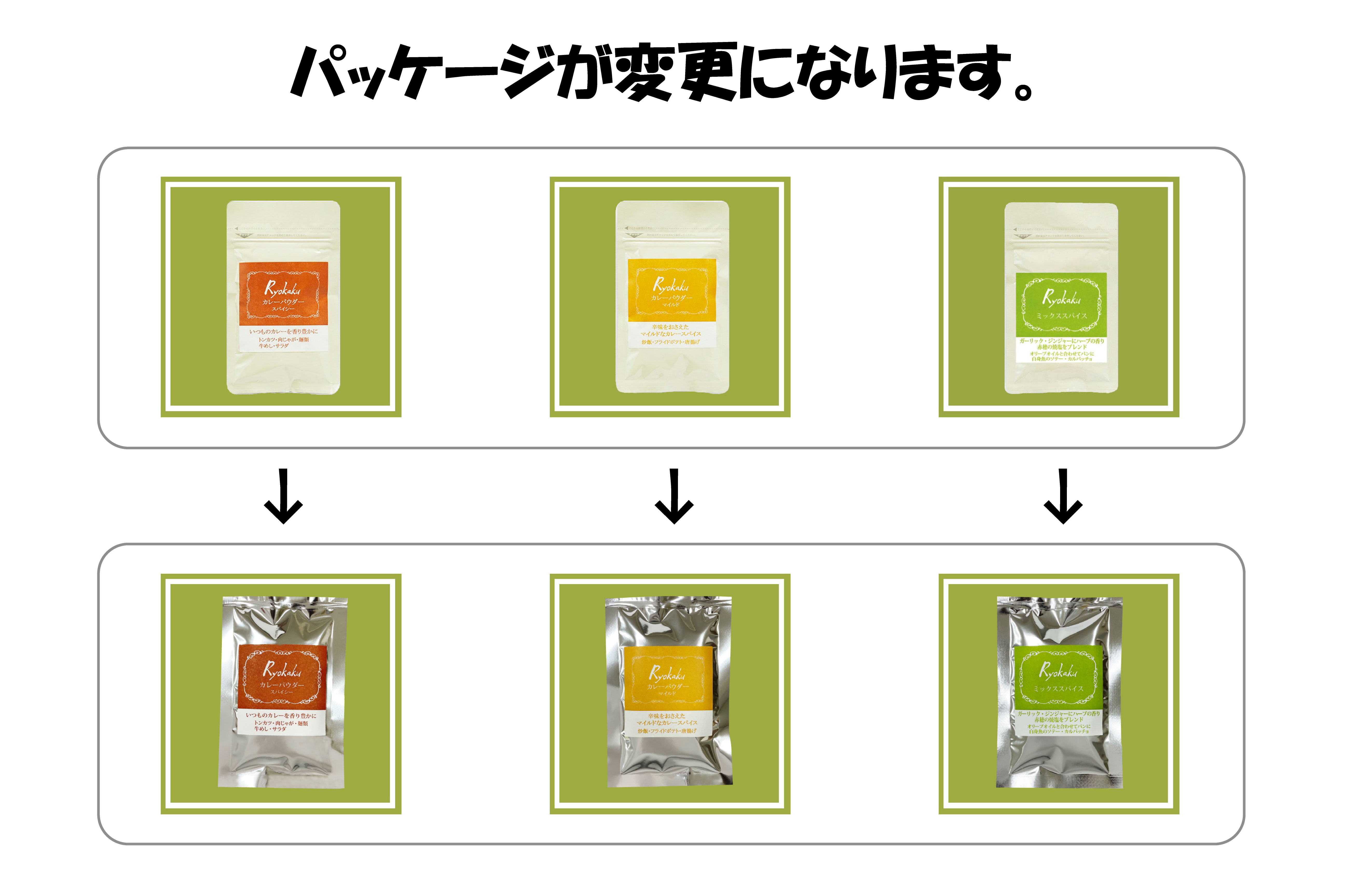 スパイス袋商品パッケージ変更のお知らせ いつもご利用いただきありがとうございます。 さてこのたび、 「カレーパウダー・スパイシー、カレーパウダー・マイルド、ミックススパイス」の袋のパッケージを 順次変更させていただきます。 ※新パッケージには、保存用のチャックはついておりませんのでご了承くださいませ。 今後も引き続きご愛顧を賜りますようお願い申し上げます。